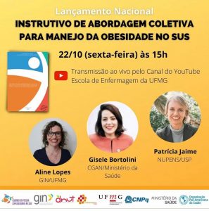 Hoje, 22/10 (sexta-feira), às 15 horas, será realizado o lançamento do “Instrutivo de Abordagem Coletiva para Manejo da Obesidade no SUS”, o evento será online e transmitido ao vivo no Canal Youtube da Escola de Enfermagem da Universidade Federal de Minas Gerais da UFMG, com emissão de certificado. O Instrutivo tem como objetivo apoiar as equipes e profissionais de saúde para o manejo da obesidade no SUS, com ênfase na abordagem coletiva.